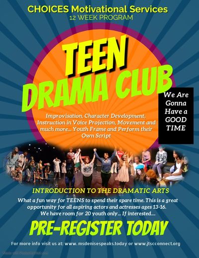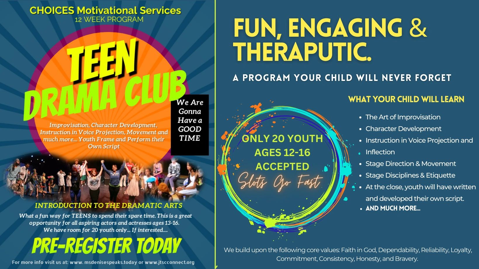 CHOICES Motivational Services LLC is a not-for-profit, prevention, intervention and solution driven organization. We are a comprehensive, interactive mental health program designed to address the behavior and character development in middle and high school students. We believe that youth need more positive reinforcements. Therefore, our workshop/discussion group experience is most effective as a two hour, once a week, six-week program. Although the modules can be delivered separately topic by topic, each topic comes with a dramatic arts component that is fun and engaging.